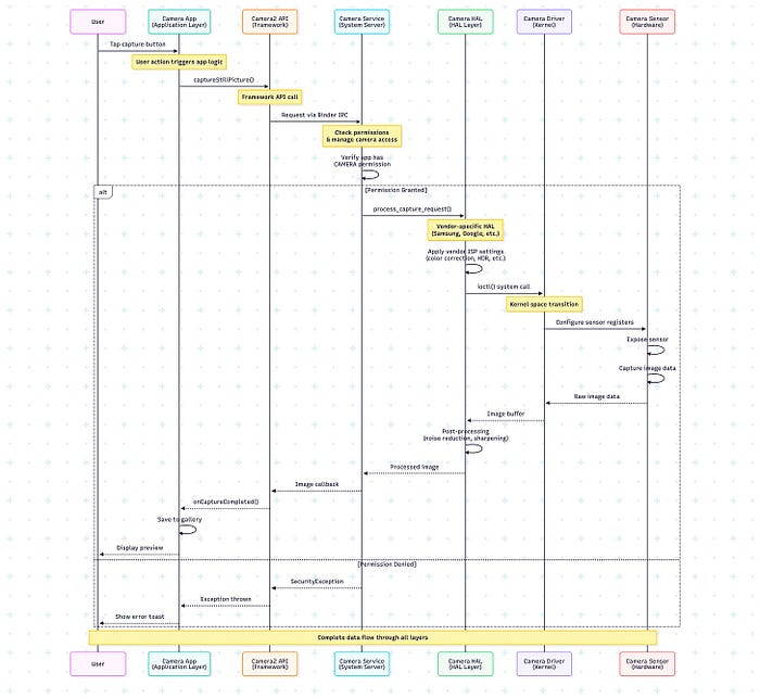 User Action: Take photo │ ├─ Camera App (Application Layer) │ └─ Uses Camera2 API │ ├─ CameraManager (Framework) │ ├─ Permission check │ ├─ Camera session management │ └─ Binder IPC to Camera Service │ ├─ Camera Service (System Server) │ ├─ Arbitrates camera access │ └─ Routes to Camera HAL │ ├─ Google Camera HAL (HAL Layer) │ ├─ HDR+ processing │ ├─ Night Sight algorithm │ ├─ Portrait mode depth calculation │ └─ Calls kernel driver │ ├─ Camera Driver (Kernel) │ ├─ I2C commands to sensor │ ├─ DMA for image transfer │ └─ ISP configuration │ └─ Sony IMX Sensor (Hardware) └─ Captures photons → digital data