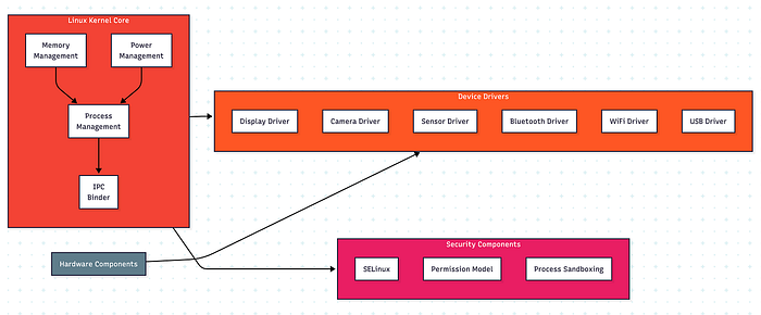 - Device Drivers: Interfacing with hardware components (display, camera, sensors)